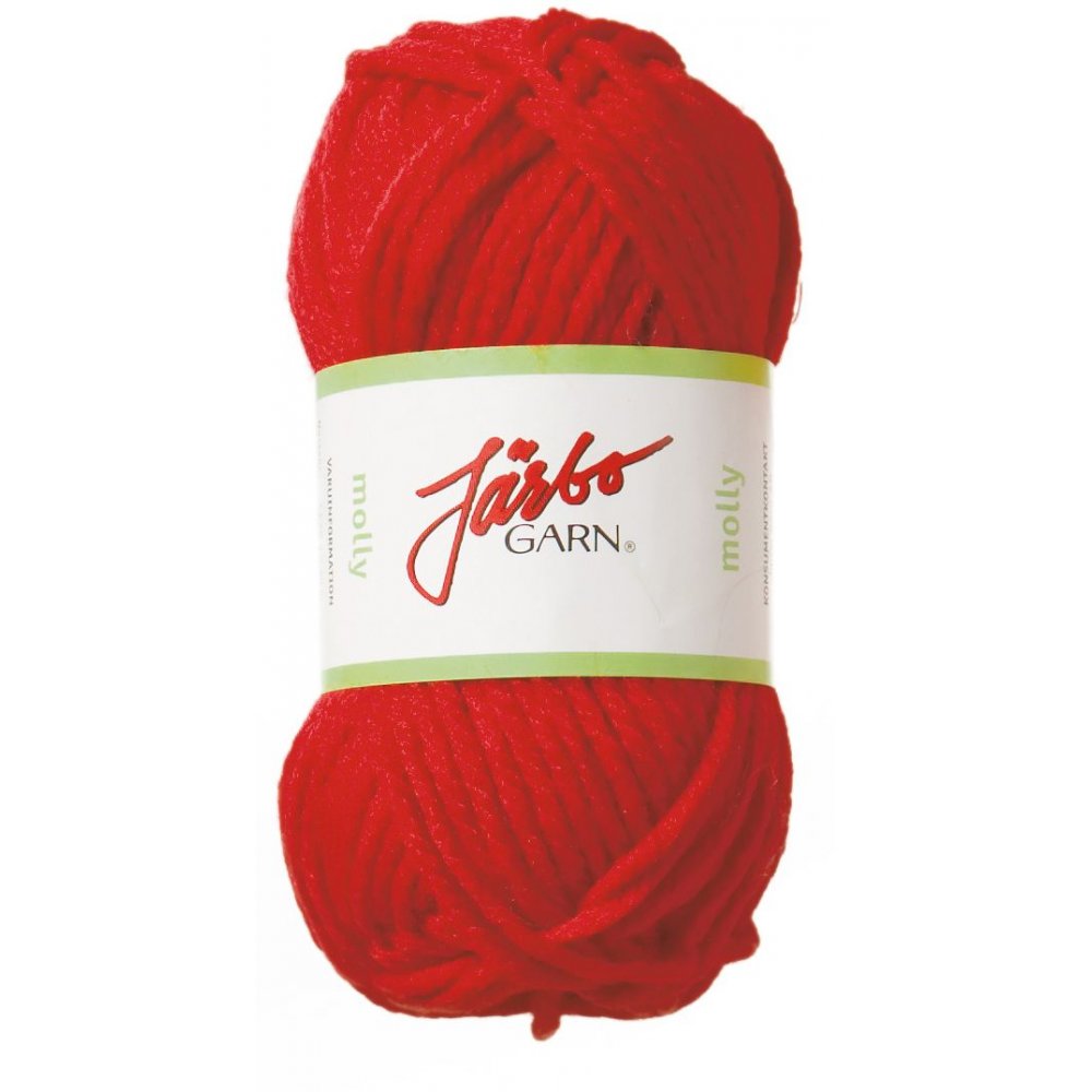 Molly är nog det skönaste mest användbara akrylgarn jag funnit till mössor, vantar mm. Tjockt, mjukt och lättstickat/virkat. Just denna röda har blivit flera par virkade bebisballerinaskor.