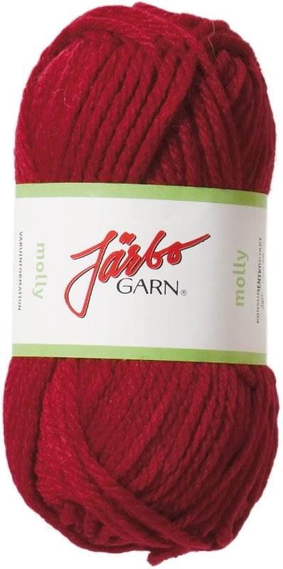Molly är nog det skönaste mest användbara akrylgarn jag funnit till mössor, vantar mm. Tjockt, mjukt och lättstickat/virkat. Just denna röda har blivit flera par virkade bebisballerinaskor.